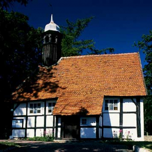 Lotnicze, EU, PL, Pomorskie. Kaszubski Park Krajobrazowy. Kosciol we wsi Wygoda Laczynska.