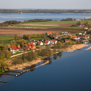Lotnicze, EU, PL, Pomorskie. Kaszubski Park Krajobrazowy. Wies Chmielno na tle jeziora Klodno.