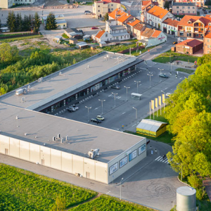 Biskupiec - panorama na centrum miasta. EU, Pl, warm-maz, LOTNICZE.