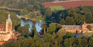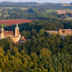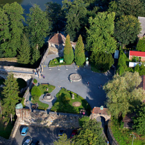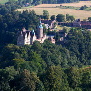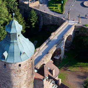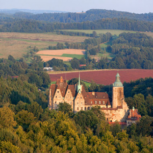 Panorama na Zamek Czocha przez jezioro Lesnianskie. EU, Pl, Dolnoslaskie. Lotnicze.