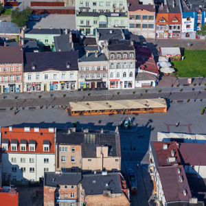 Inowroclaw. Panorama od str. S na ulice Poznanska. EU, Pl, Kujawsko-Pomorskie. LOTNICZE.