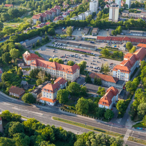 Olsztyn, ulica Wincentego Pstrowskiego z budynkami KWP w Olsztynie. EU, PL, Warm-Maz. LOTNICZE.