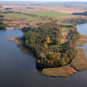 Jezioro Swiecajty, panorama na Wegorzewo, n/z widoczna Wyspa Kocia. EU, Pl, Warm-Maz. Lotnicze.