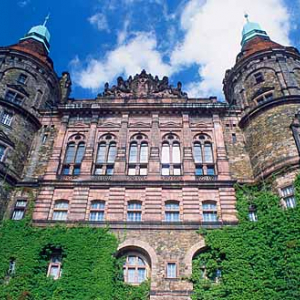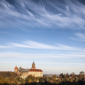 Zamek Ksiaz, panorama z lotu ptaka. EU, Pl, Dolnoslaskie. Lotnicze.