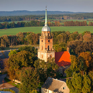 Czachow, wiejski kosciol. EU, Pl, Lubuskie. Lotnicze.