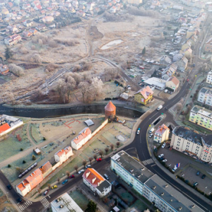 Dobre Miasto, Bociania Baszta z fragmentem obwarowan Miejskich. EU, PL, Warm-Maz. Lotnicze.