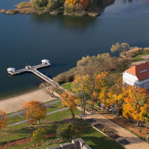 Szczytno, panorama miasta widoczna od strony W przez jezioro Domowe Duze EU, Pl, Warm-Maz. Lotnicze.