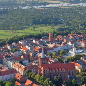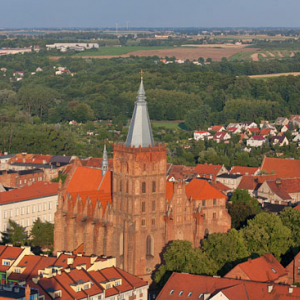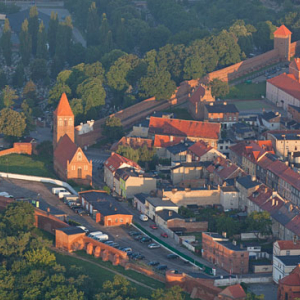 Chelno, Stare Miasto z dawna wieza cisnien. EU, Pl, Kujawsko-Pomorskie. Lotnicze.