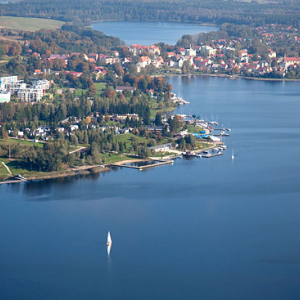 Ryn, centrum miasta widoczne przez jezioro. EU, PL, Warm-Maz. Lotnicze.