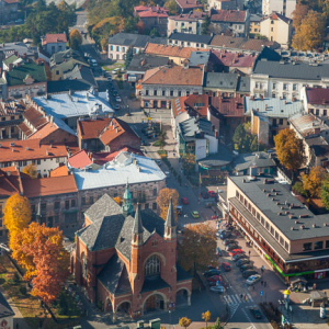 Nowy Sacz, ulica Lwowska na tle Starego Miasta. EU, Pl, Malopolska. Lotnicze.