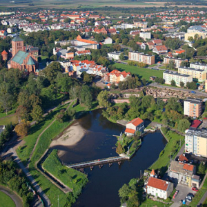 Braniewo, panorama na kosciol sw. Katarzyny przez most na ul. Gdanskiej. EU, Pl, warm-maz.