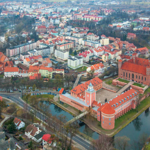 Lidzbark Warm. dn. 12.04.2016 r. Zamek Biskupow Warminskich z Przedzamczem - Hotelem Krasicki w otoczeniu rzeki Lyny, Symsarny i fosy. EU, Pl, warm-maz. Lotnicze.