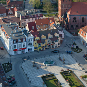 Biskupiec, centrum miasta z rynkiem. EU, Pl, Warm-Maz. Lotnicze.