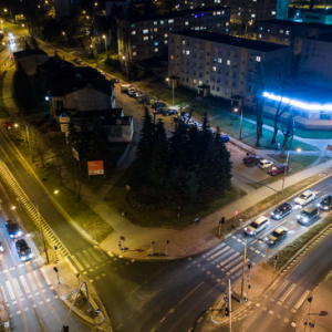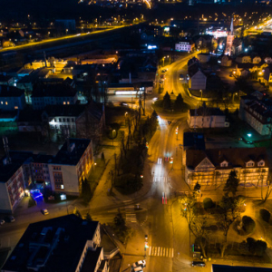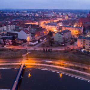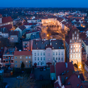 Bartoszyce, srodmiescie widoczne z lotu ptaka wieczorowa pora, 30.12.2017 r.. EU, PL, warm-maz. Lotnicze.