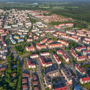 Olsztyn, panorama na dworzec autobusowy ze stanowiskami. EU, PL, warm-maz. Lotnicze.