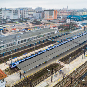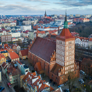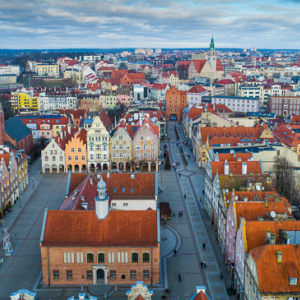 Olsztyn, panorama na rtusz nowomiejski przez aleje Pilsudskiego. EU, PL, warm-maz. Lotnicze.