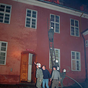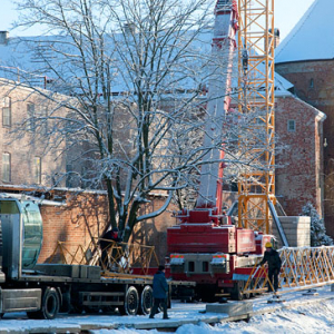 Lidzbark Warm, rycerz Michal Archaniol na wiezy koscielnej. EU, PL, Warm-maz. Lotnicze.