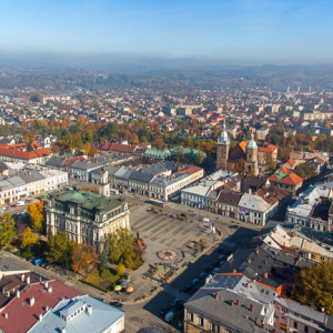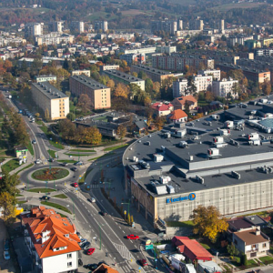 Nowy Sacz, panorama Starego Miasta. EU, PL, malopolskie. Lotnicze.
